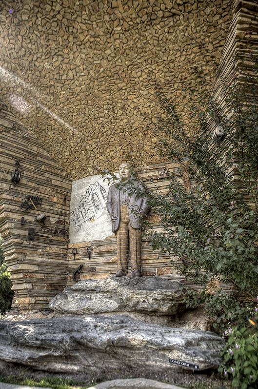 The photo shows a stone statue of a man in trousers and a jacket, positioned within a carved stone alcove at Gilgal Sculpture Garden in Salt Lake City. The background is a textured wall made of layered sandstone, with sculpted details including symbolic carvings. A tree partially frames the right side of the scene, adding greenery against the warm tones of the rock