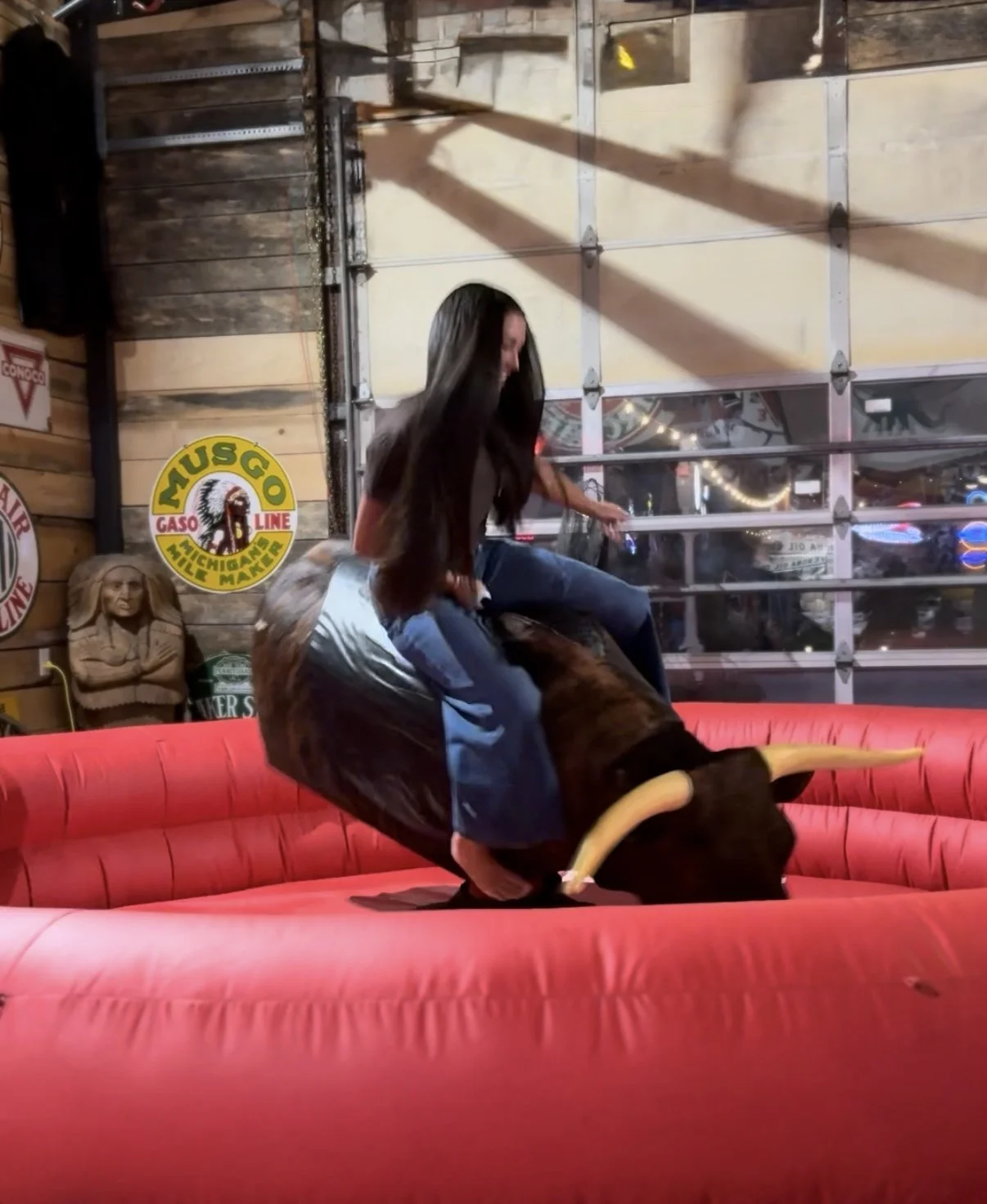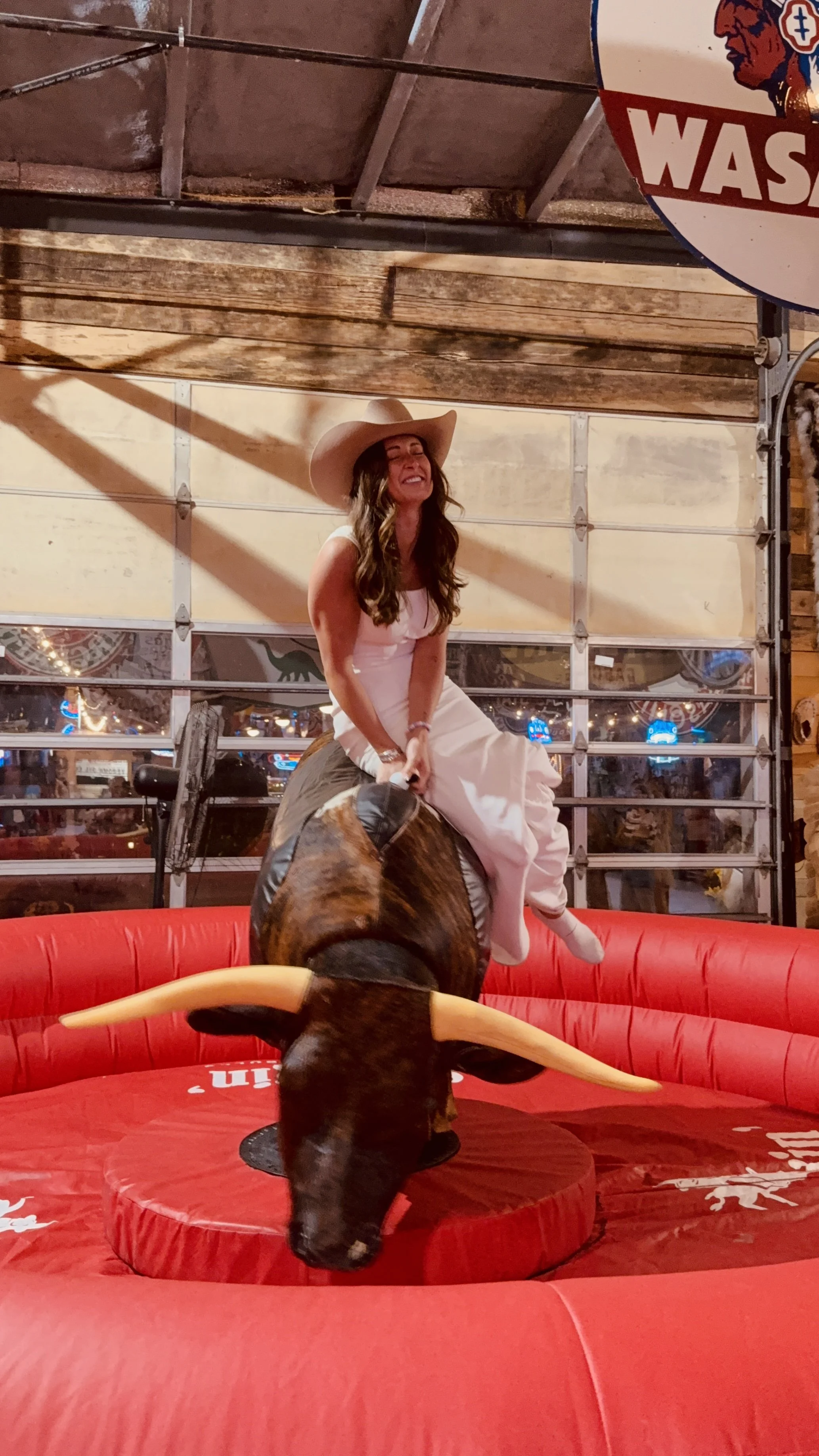 A young woman rides a mechanical bull inside a rustic venue, gripping the handle with one hand, surrounded by vintage gas station signs and western decor of Spark Museum and Event Center