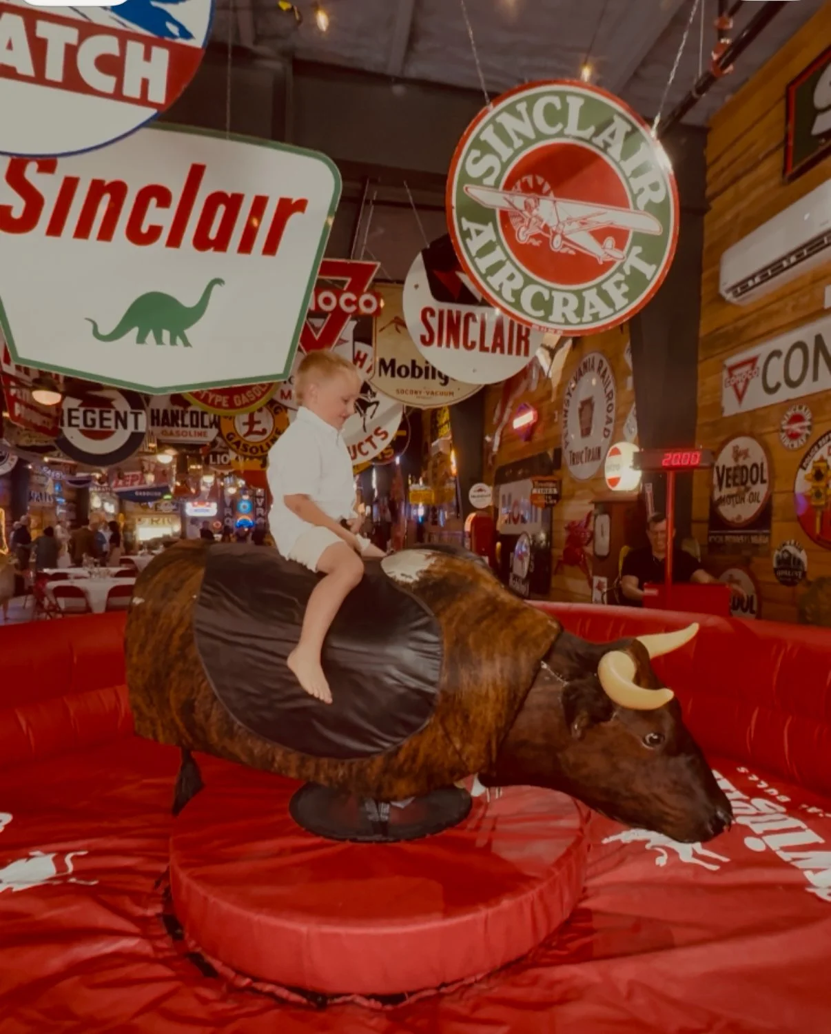 A mechanical bull setup ready for action at a lively reception venue, surrounded by vintage gas station signs and bold red padding provided by “Swingin’ Mechanical Bulls,” creating a playful and nostalgic western atmosphere.