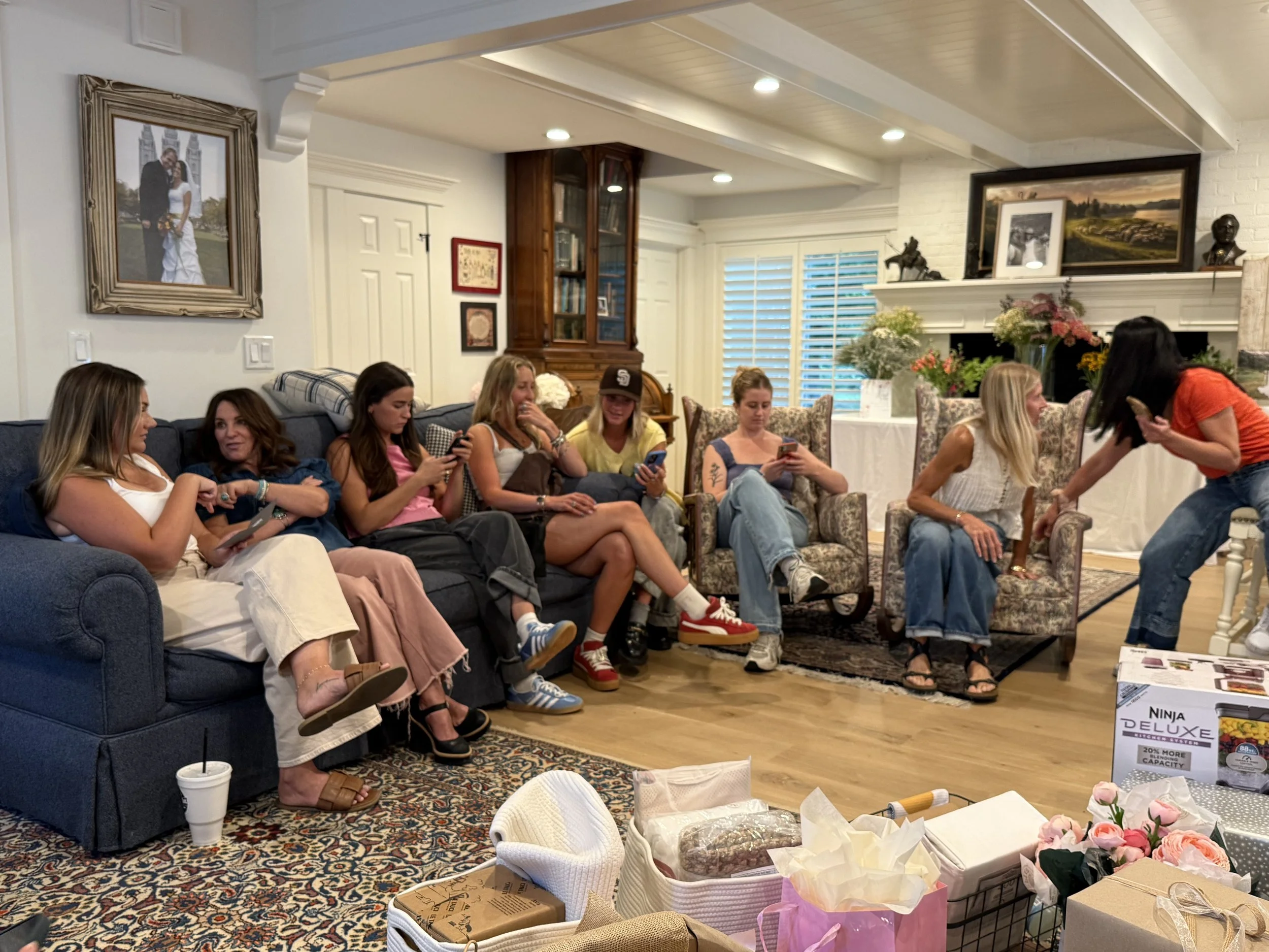 A group of friends gathered in a cozy living room for a wedding shower, surrounded by wrapped gifts, floral arrangements, and warm conversations as they celebrated the bride-to-be.