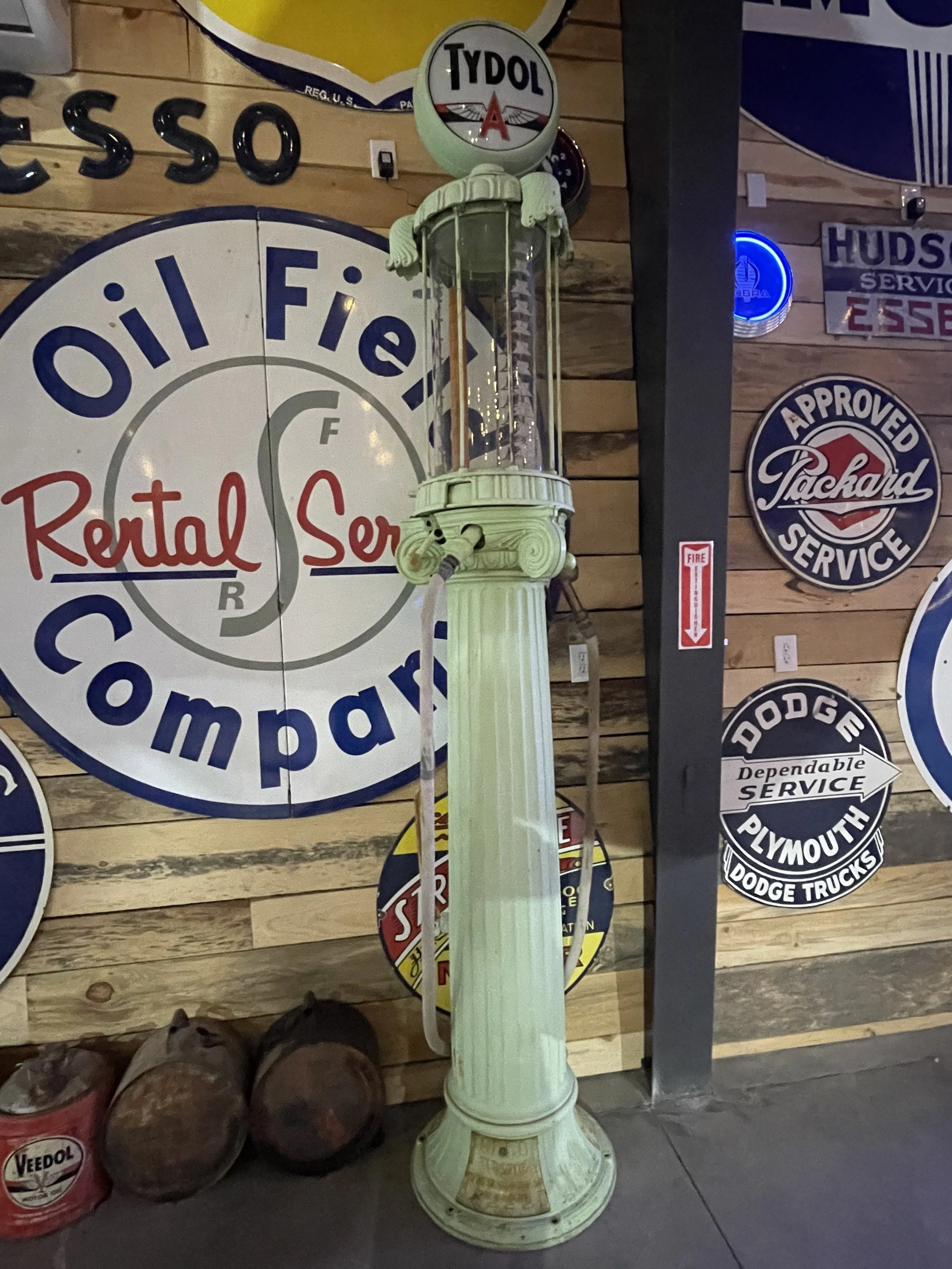 A friend in Joplin told Sparky the he had traded for the upper cast portion of a CV700 pump an dit was for sale. Sparky obviously bought it plus some of the parts that another friend had accumulated to go with it. It was lacking a lot of parts but had the beginnings. He found the cool nozzles in Indiana and the glass cylinders at the swap meet in Hershey, PA. He had the new skins made locally. Some of the smaller parts, [price glass, and a few details he found in Edmonton ,Canada. The owner refused to ship the parts so a road trip it was. Eventullay he had all the parts to restore it and put it on display next door at AAA Lakeside Storage until we build Sparks Museum and Event Center when he moved it inside. Red Indian is a Canadian gas brand and they were bought out by Texaco that that is why we have it in front of our Texaco collection.
