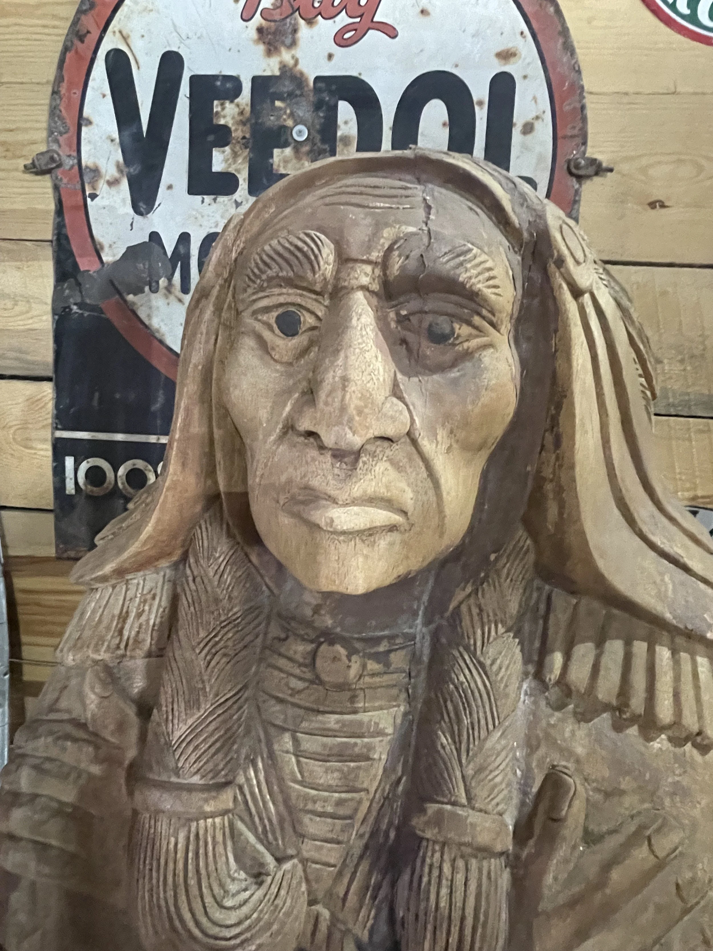 Our hand carved out of one tree Native American Indians came from an antique store out near Tremonton ,Utah. While Sparky was visiting an antique event near Ogden that has dealers from all over that come to show and tell as well as sell their treasures. This is where he met a dealer that had one of these beautiful carvings. After discussing price he actually had three that we could not pass up. Sparky bought two and his son bought the other. They sat at his home in Sundance out front for years until we recently relocated them to be on display in the Museum.