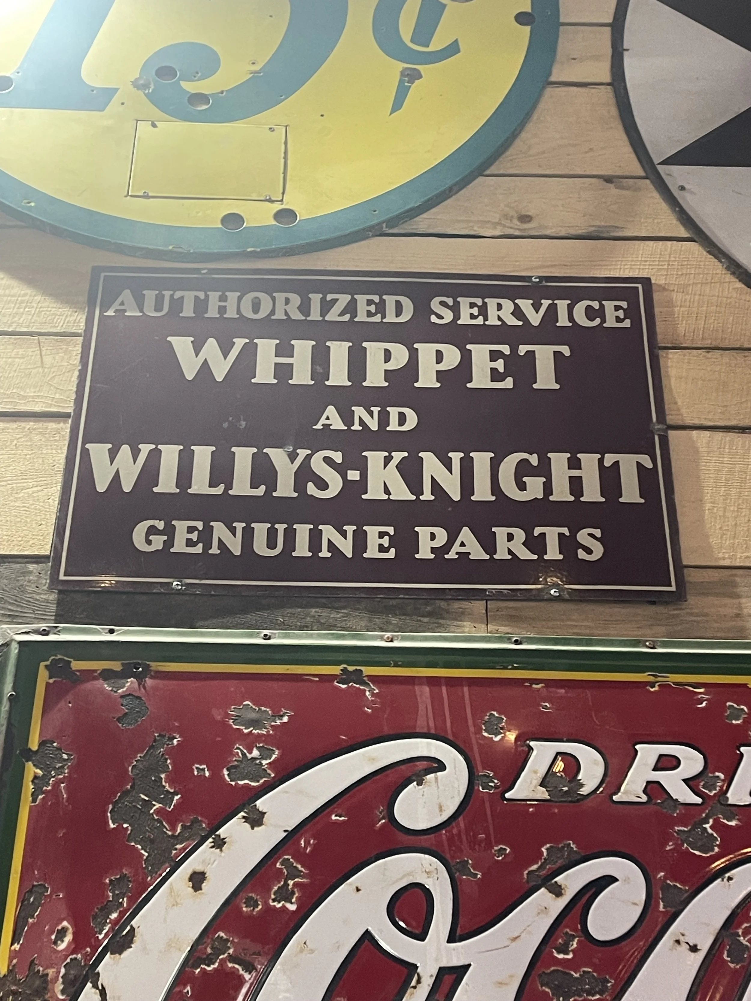 This is an original sign we purchased of f of Ebay. We have had it many years and found the perfect space to place it in the museum. We like almost anything old and that has something to do oikWhippet and Willys Knight was and Antique car that was made in the 20s and 30s. We just liked the sign so bought it.