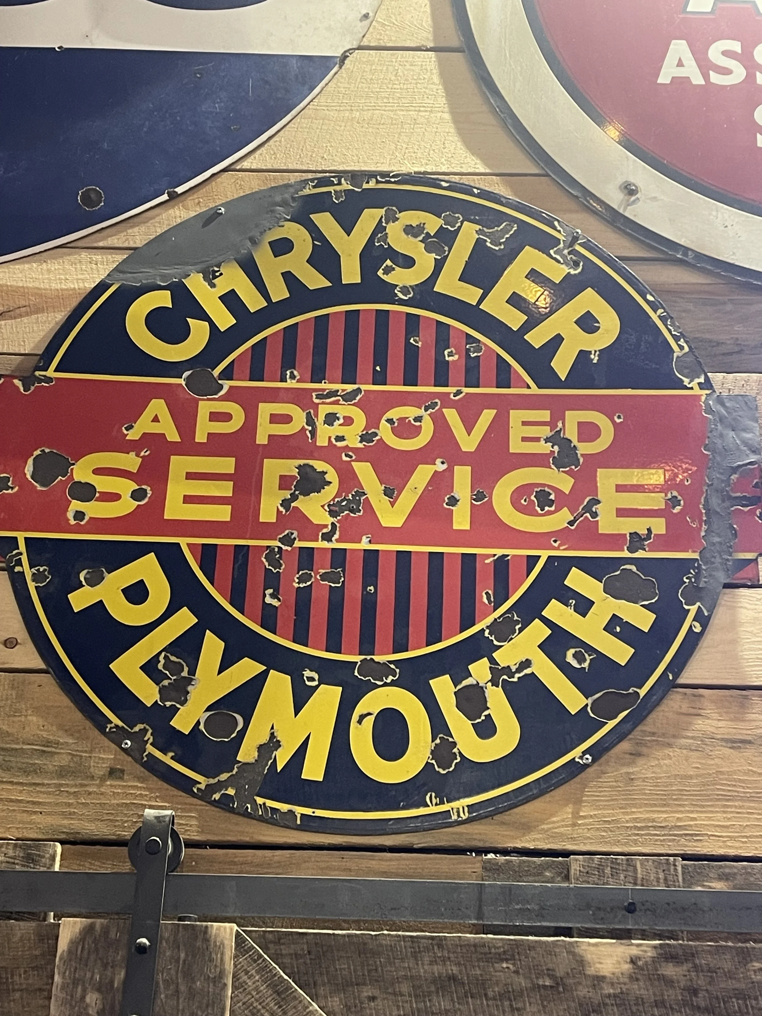 Plymouth sign came from our friend and picker Chuck Dudley. It was a rough sign that we needed because of the colors and look. Again it is a sign we just like:)