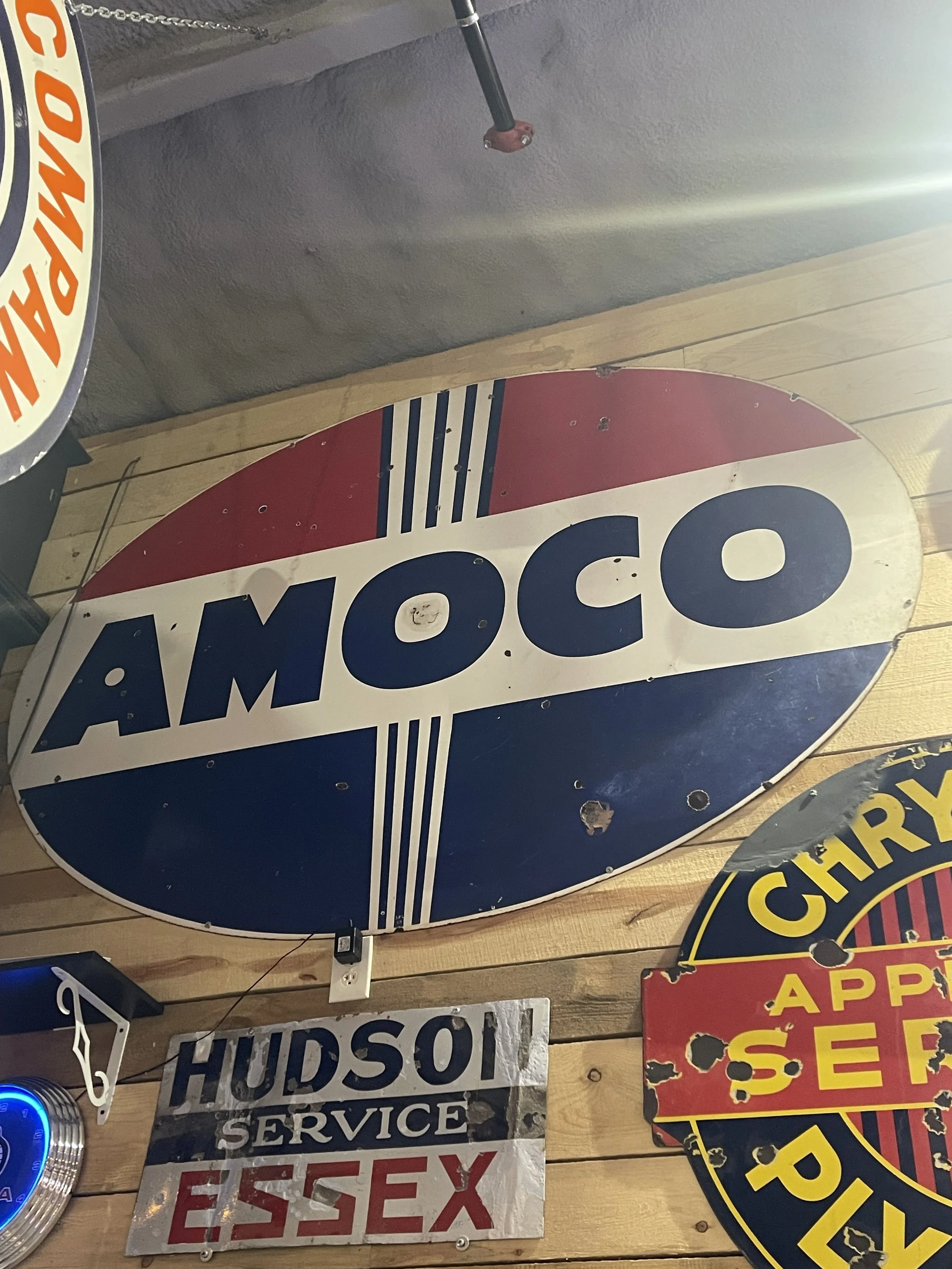 This sign came from Indianola , Iowa from a Picker named Gary. Amoco was a Standard Oil company where they went from Standard to American to Amaco. They bought out UTOCO. All gas and oil is connected somewhere as it started with ONE and branched and sold and sold again which is why we get to have so many brands and beautiful signs displaying in our Musuem.