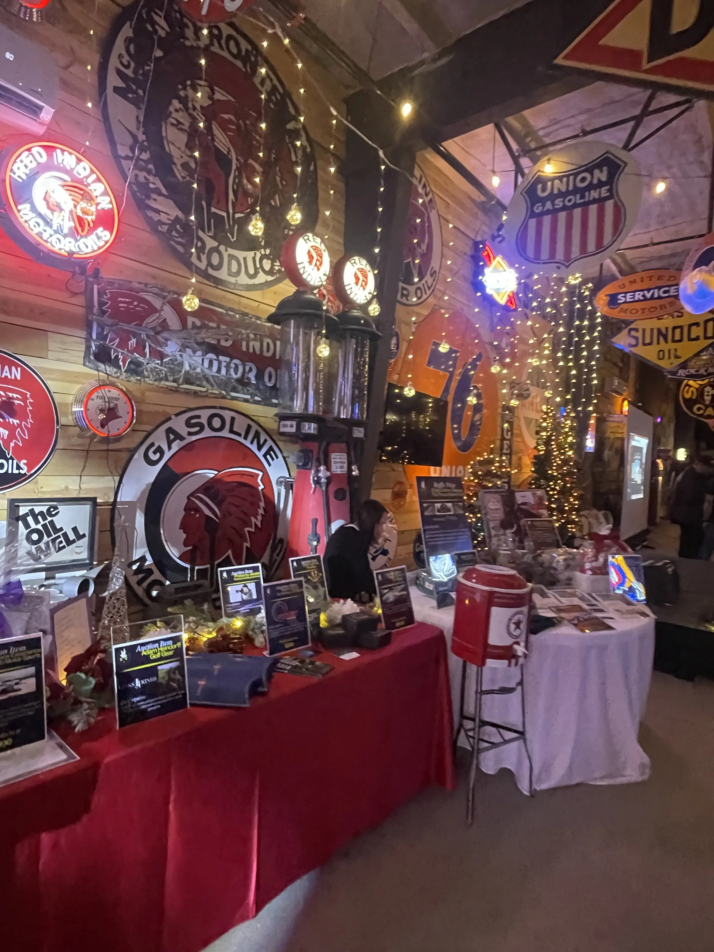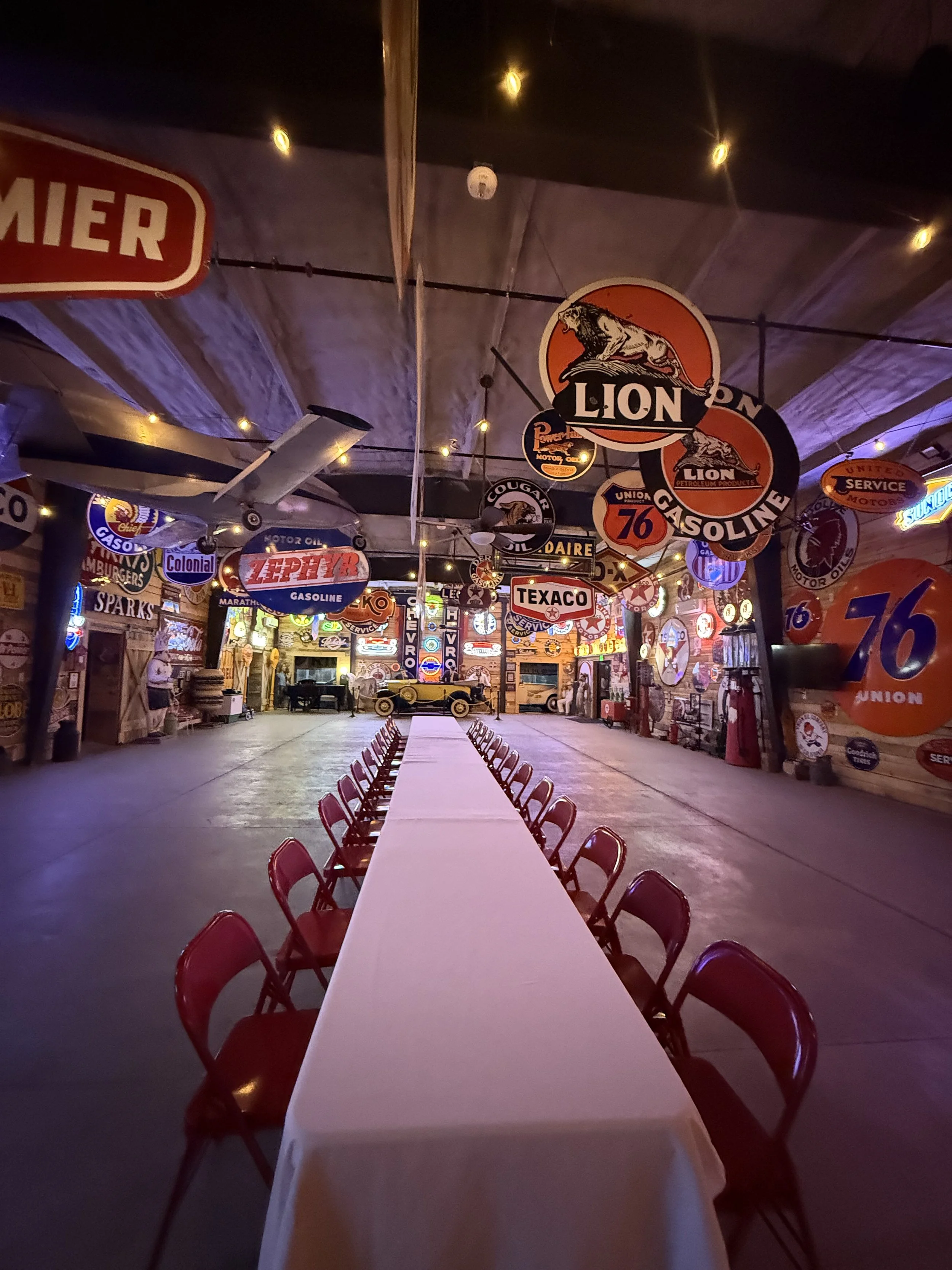 sparks museum and event center with long tables a white table cloth and red chairs. Petroliana as the decoration.