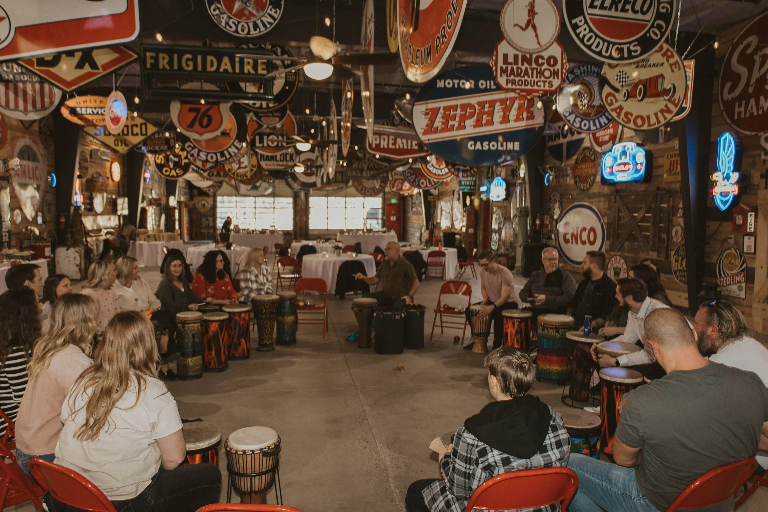 Our Venue was ecstatic when Stratus Hr rented our space and had Drumbus.com come for their event. It was amazing to listen to the guests participate. It wasn’t long before the guests were drumming together, laughing and team building. Sparks was a perfect place for both a dinner as well as an activity of this kind.
