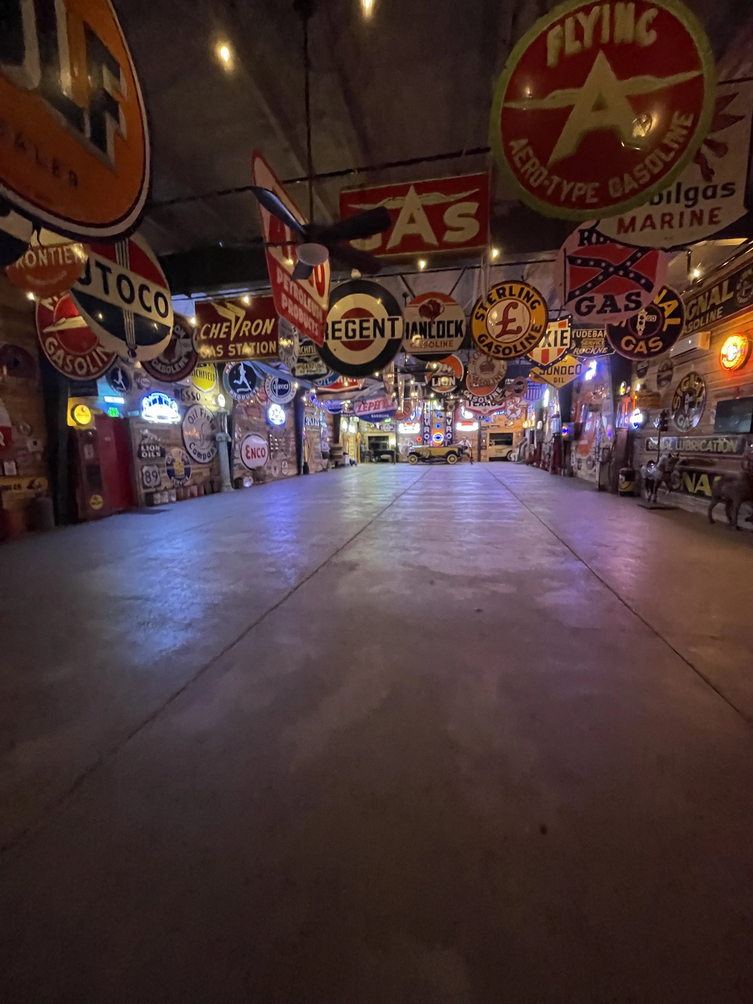 Sparks Museum and Event center with Porcelain signs hanging from the ceiling , gas pumps around the end and mannequins of Marilyn Monroe, Elvis Presley and the Blues Brothers.